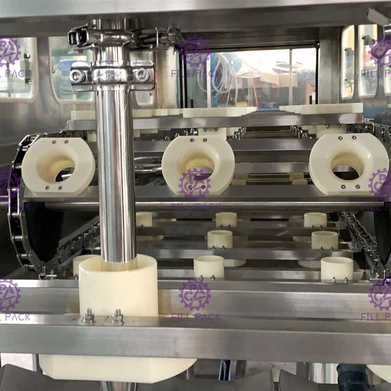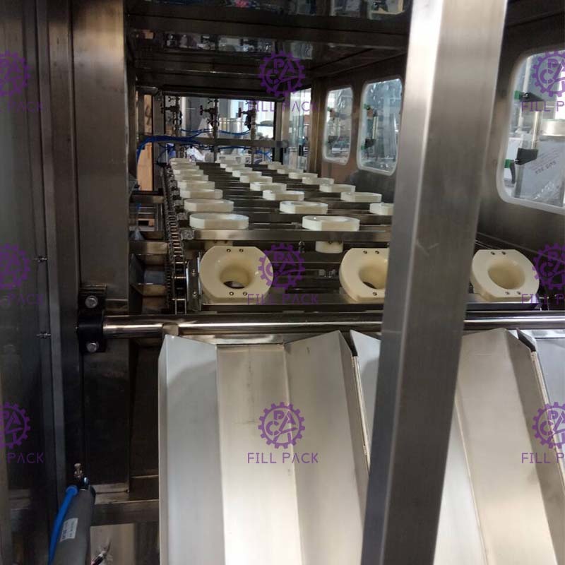 ถังที่ทําความสะอาดถูกขนส่งโดยกลไกขนส่งโซ่และตกบนกลไกถังกลไกถังจะแก้ไขถังว่างและการเติมเริ่มต้นเวลาการเติมสามารถปรับตามอัตราการไหลของปั๊มเติม